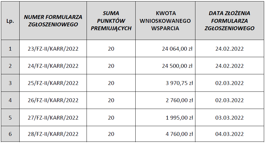 W trakcie trwania naboru, przyjęto formularze zgłoszeniowe na kwotę 62 049,75 PLN, dostępna kwota alokacji wynosiła 87 050,00 PLN, co stanowi 71,28 % jej wykorzystania.