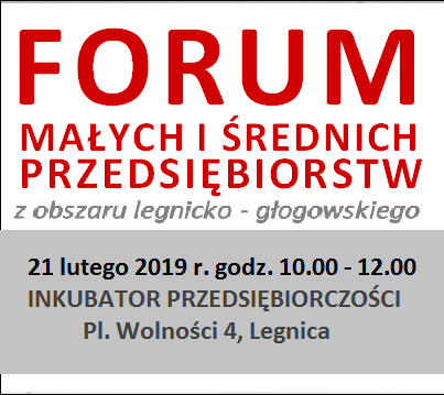Jeśli myślisz o rozwoju swojej firmy, chcesz, by była postrzegana jako nowoczesne i konkurencyjne przedsiębiorstwo, potrzebujesz dofinansowania - przyjdź na FORUM MAŁYCH I ŚREDNICH PRZEDSIĘBIORSTW Z OBSZARU LEGNICKO - GŁOGOWSKIEGO. Już 21 lutego 2019 roku w Inkubatorze Przedsiębiorczości w Legnicy
