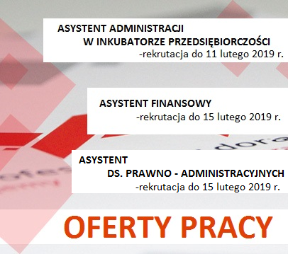 Szanowni Państwo, Informujemy, że obecnie poszukujemy osób na stanowiska: Asystent administracji w Inkubatorze Przedsiębiorczości - rekrutacja do 11.02.2019 r. Asystent finansowy - rekrutacja do 15.02.2019 r. Asystent ds. prawno-administracyjnych - rekrutacja do