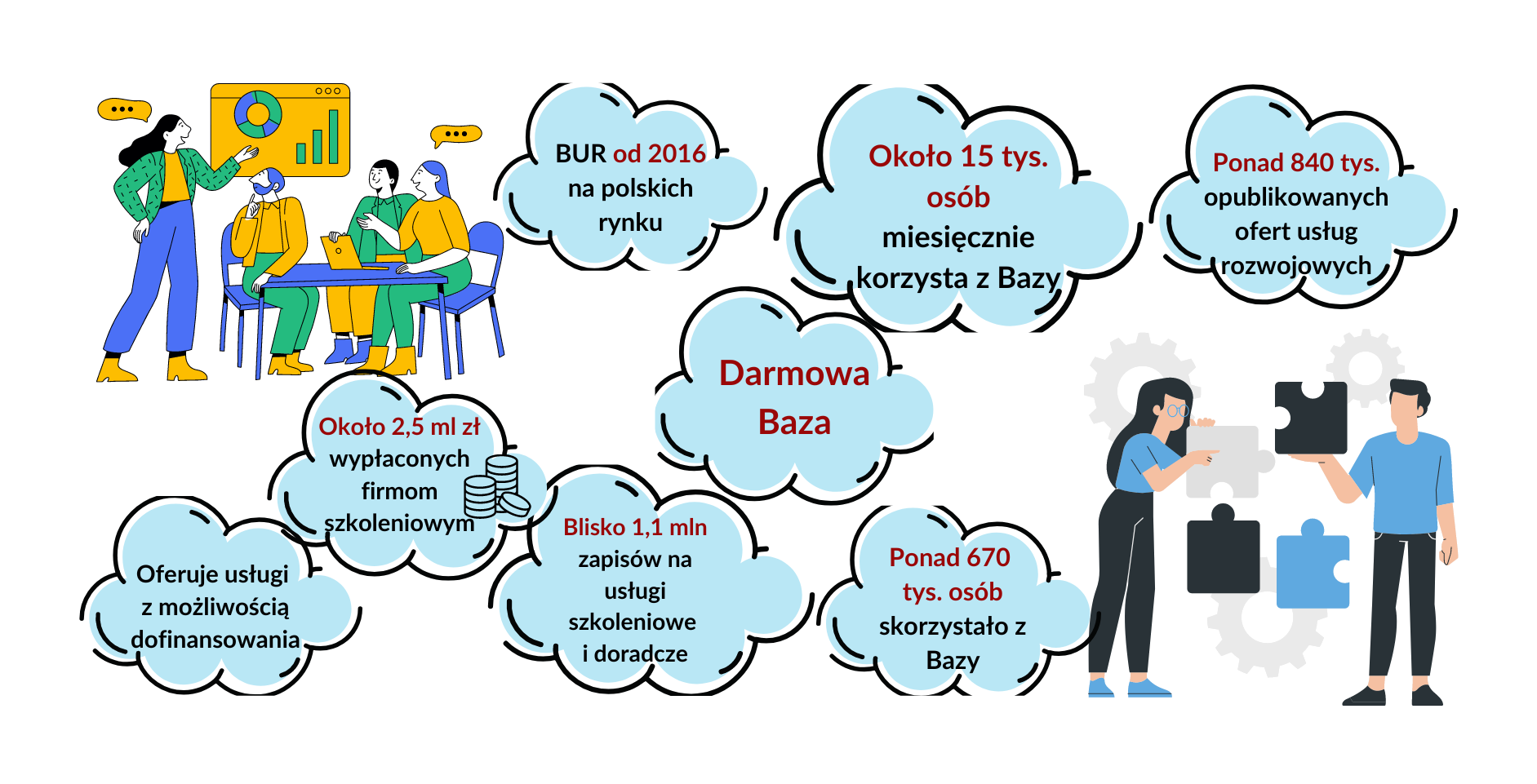 Teraz z Bazy mogą korzystać mieszkańcy wszystkich 16 województw. Dzięki Bazie Usług Rozwojowych z dofinansowanych szkoleń mogą korzystać pracownicy, pracodawcy, a także osoby indywidualne – więc zwiększa się grono odbiorców Twoich usług!